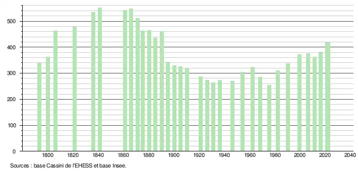 L'évolution du nombre d'habitants est connue à travers les recensements de la population effectués dans la commune depuis 1793. Pour les communes de moins de 10 000 habitants, une enquête de recensement portant sur toute la population est réalisée tous les cinq ans, les populations de référence des années intermédiaires étant quant à elles estimées par interpolation ou extrapolation[22]. Pour la commune, le premier recensement exhaustif entrant dans le cadre du nouveau dispositif a été réalisé en 2006[23].