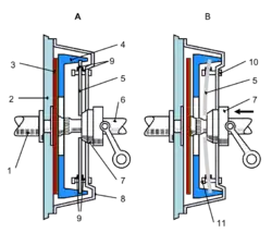 - le plateau de pression s'écarte pour libérer la pression sur le disque de friction. Le mouvement est de moins en moins transmis, rendant indépendante la boîte de vitesses du moteur. Cela permet, par exemple, de rester à l'arrêt sans caler le moteur, ou de changer de vitesse.
