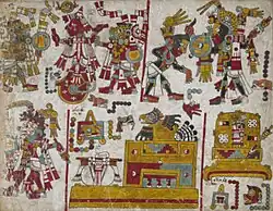 La métaphysique nahua est centrée sur le teotl, « un pouvoir, une énergie ou une force sacrée unique, dynamique, vivifiante, éternellement auto-génératrice et auto-régénératrice »[63], conceptualisé dans une sorte de panthéisme moniste[64] tel qu'il se manifeste dans le dieu suprême Ometeotl[65], ainsi qu'un vaste panthéon de dieux mineurs et d'idéalisations de phénomènes naturels tels que les étoiles et le feu[66]. Les prêtres et les classes supérieures éduquées avaient des vues plus monistes, tandis que la religion populaire des personnes non éduquées avait tendance à embrasser les aspects polythéistes et mythologiques[67].