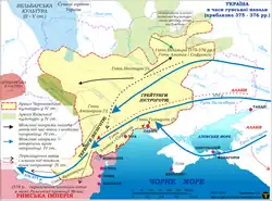- 375 : forte poussée des Huns qui défont les Ostrogoths de la steppe pontique, établis au nord de la mer Noire.