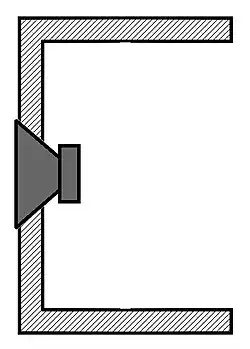 Il s'agit simplement d'une boîte hermétique, dont le but est de supprimer le court-circuit acoustique en emprisonnant le rayonnement arrière dans un volume relativement petit[19]. On peut la remplir ou la capitonner d'un matériau absorbant suivant les besoins. La membrane est en « suspension acoustique », car le volume d'air (VB) contenu agit comme un ressort et la freine[19]. De ce fait son volume doit être calculé en fonction des caractéristiques du haut-parleur : fréquence de résonance à l'air libre (FS ou FR), volume d'air équivalent à l'élasticité de la suspension (VAS) et, de son coefficient de surtension total (QT ou QTS).