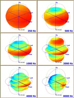 La directivité est rarement indiquée pour les enceintes grand public mais fait partie des spécifications essentielles des modèles professionnels. Le constructeur indique l'angle sous lequel l'enceinte est utilisable, et avec quel niveau d'atténuation. Il ne s'agit là que de la directivité horizontale mais un phénomène similaire se produit dans l'axe vertical : la directivité est donc indiquée sous les deux angles. Par exemple 60° × 40° : soixante degrés horizontalement et quarante degrés verticalement, pour une atténuation de dB par rapport à la réponse dans l'axe.