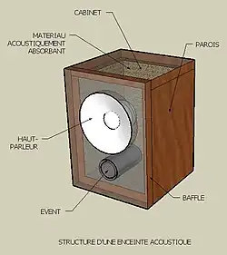 Une enceinte est un coffret comportant un ou plusieurs haut-parleurs, permettant la reproduction du son à partir d'un signal électrique fourni par un amplificateur audio[1]. La partie amplification peut être intégrée ou non à l'enceinte, et des dispositifs électroniques comme des filtres sont souvent incorporés.