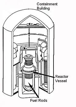 Pour une même puissance électrique fournie, l'enceinte de confinement d'un réacteur à eau bouillante (REB) est de moindre envergure que celle d'un réacteur à eau pressurisée (REP) car leurs circuits primaires sont pressurisés à 70 bar (REB) et 150 bar (REP), respectivement.