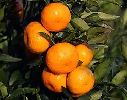 'Encore' en grappe sur l'arbre - ‘Tsunokagayaki’ est un hybride entre 'Kyow n° 14' [‘Kiyomi’ (C. unshiu × C. sinensis) × ‘Okitsu-Wase’ ] et ‘Encore’ réalisé en 1984 à Nagasaki, sélectionné en 1989, et nommé Mikan Norin N°.17 ‘Tsunokagayaki’ en mars 2008, et enregistré en 2009 (pleine saison)[14].