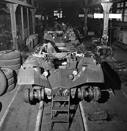 Les pneus montés sur les roues externes pèsent chacun 150 kg, ils sont composés d'une enveloppe interne Michelin Metallic F24 avec un boudin increvable interne Weil Picard en caoutchouc alvéolé, les alvéoles étant remplis d'un gaz neutre sous pression : l'azote[15]. Si un alvéole est percé, les autres se dilatent afin d'occuper l'espace de celui endommagé, permettant ainsi de maintenir une cohérence de l'ensemble. Des freins à tambour sur chaque moyeu assurent le freinage. Chaque roue « agricole » comprend un flasque, en alpax moulé, fixé au moyeu par 80 boulons. Sur ce flasque vient se fixer la jante en duralumin, des silentblocs en caoutchouc spécial, permettant un déplacement latéral de cette dernière de 3 cm tout en insonorisant la roue. La jante est garnie de crampons en acier de forme spéciale pour éviter le bourrage. Son orientation est inverse pour deux roues du même côté, d'où deux types de roues « agricoles » : l'une avant gauche - arrière droit, l'autre avant droit, arrière gauche.