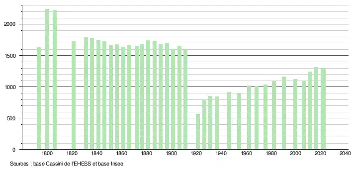 L'évolution du nombre d'habitants est connue à travers les recensements de la population effectués dans la commune depuis 1793. Pour les communes de moins de 10 000 habitants, une enquête de recensement portant sur toute la population est réalisée tous les cinq ans, les populations de référence des années intermédiaires étant quant à elles estimées par interpolation ou extrapolation[39]. Pour la commune, le premier recensement exhaustif entrant dans le cadre du nouveau dispositif a été réalisé en 2006[40].