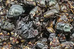 - Dundubia intemerata, une espèce de cigale, est consommée bouillie, ce qui fait considérer sa consommation plus proche de celle d’un légume que d’un animal[60]. La larve de Oryctes rhinoceros est cuite dans du lait de noix de coco pendant une heure avant d’être rôtie. La grande nèpe, Lethocerus indicus est très recherchée ; bouillie avec des crevettes, son goût rappelle le gorgonzola.