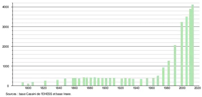 L'évolution du nombre d'habitants est connue à travers les recensements de la population effectués dans la commune depuis 1793. À partir du , les populations légales des communes sont publiées annuellement dans le cadre d'un recensement qui repose désormais sur une collecte d'information annuelle, concernant successivement tous les territoires communaux au cours d'une période de cinq ans. Pour les communes de moins de 10 000 habitants, une enquête de recensement portant sur toute la population est réalisée tous les cinq ans, les populations légales des années intermédiaires étant quant à elles estimées par interpolation ou extrapolation[6]. Pour la commune, le premier recensement exhaustif entrant dans le cadre du nouveau dispositif a été réalisé en 2005[7],[Note 1].