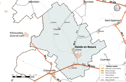 La commune est traversée par deux routes départementales : une route importante, la RD 2157, ex RN 157, qui relie Saint-Jean-de-la-Ruelle à Charsonville dans le Loiret et se prolonge vers Blois, supportant en 2016 un trafic de 2 094 véhicules/jour dont 1 164 PL/j (19.1 %), et une route à faible trafic[Note 3], la RD 4, qui relie Tournoisis à Épieds-en-Beauce et supporte en 2016 un trafic de 503 véhicules/jour dont 65 PL/j (12.9 %)[32]. Complétant ces voies, la commune est sillonnée de plusieurs voies communales et chemins ruraux desservant ses fermes et hameaux et les bourgs environnants.