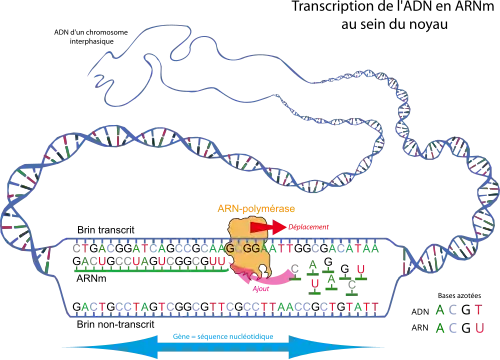 La transcription est la copie du code génétique de l'ADN en ARN. La double hélice de l'ADN est ouverte et une chaîne d'ARN complémentaire de l'ADN matrice est formée par le complexe de l'ARN polymérase II. Dans le cas des gènes dits « codants » (c'est-à-dire qui codent des protéines), cet ARN messager sert de matrice à la synthèse de protéines lors de l'étape de traduction. De nombreux gènes codent des protéines régulatrices appelées facteurs de transcription, dont la fonction est de moduler l'expression d'autres gènes.