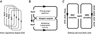 Certains facteurs de transcription comme HNF4 et MyoD sont susceptibles d'activer leur propre expression, engendrant ainsi une boucle dite d'autorégulation[51]. Ce mécanisme par autorégulation permet la persistance temporelle de l'expression des gènes après que le stimulus déclencheur ait cessé d'opérer. Notamment, après la division cellulaire par méiose ou mitose, si le stimulus à l'origine de l'activation d'un gène est absent, les cellules filles peuvent hériter de cette activation (par exemple par la présence de ces facteurs de transcription). Une telle régulation qui opère en trans, est retrouvée chez des procaryotes (exemple du phage Lambda[52]) comme chez les eucaryotes. Chez les eucaryotes multicellulaires, ce mécanisme « trans-épigénétique » par autorégulation concerne de nombreux facteurs de transcription impliqués dans la spécification de l'identité cellulaire, et est à ce titre un mécanisme épigénétique majeur.