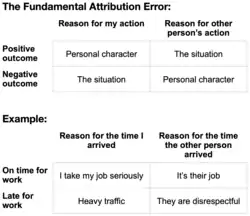 L'erreur fondamentale d'attribution est un biais psychologique qui consiste à accorder une importance disproportionnée aux caractéristiques internes d'un agent (caractère, intentions, émotions, connaissances, opinions) au détriment des facteurs externes et situationnels (faits) dans l'analyse du comportement ou du discours d'une personne dans une situation donnée. À l'inverse, ce biais nous incite à considérer les facteurs externes et situationnels parfois de manière disproportionnée par rapport aux caractéristiques internes quand nous sommes à l'origine de la situation.