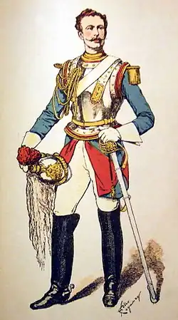 Culotte en peau de daim blanc, bottes hautes dites « à l’écuyère » garnies d'éperons dits « à la chevalière » en acier poli, gants blancs à crispins. Manteau de cheval en drap bleu clair.