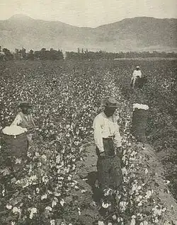 La production du coton elle n'arrive qu'un siècle plus tard, quand la part des plantations américaines dans l'offre mondiale passe brutalement de 5 % à 70 % entre 1790 et 1805, pour alimenter les fabriques de la région industrielle de Manchester, ferment de la première révolution industrielle d'Europe[32]. Le prix du coton grimpe de 50 %, de 30 à 45 cents par livre entre 1790 et 1800, avant de revenir progressivement à moins de 10 cents en 1840, avec l'extension des plantations dans l'Ouest, à grande échelle, dans quatre futurs États[32].