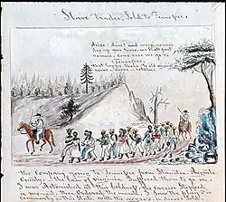 Il est généralement admis que les ventes d'esclaves ont été responsables de la majorité des déplacements d'esclaves vers l'ouest[Note 4]. Les déplacements des familles de propriétaire d'esclaves étaient eux-mêmes minoritaires et seule une minorité d'esclaves a pu suivre les pas de ses maîtres en préservant son unité familiale[réf. souhaitée]. Par ailleurs, même si, en vue de créer une force de travail capable de se reproduire, les marchands d'esclaves emportaient généralement un nombre égal d'hommes et de femmes, ils avaient peu intérêt à déplacer des familles entières[réf. souhaitée][pourquoi ?]. La traite devint la plus vaste entreprise du Sud, en dehors des plantations elles-mêmes, et probablement la plus sophistiquée dans son emploi de moyens de transports modernes, de circuits de financement innovants et de la publicité. Cette industrie développa son propre langage composé de termes tels que première main (prime hands) ou bucks (dollars en argot)[37]… Le développement de la traite négrière terrestre au sein de l'Union et l'arrêt de la traite maritime en 1808 provoquèrent une hausse du prix des esclaves qui contribua notamment à relancer économiquement les États côtiers[38].