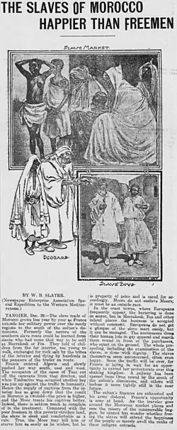 Au Maroc, le plus important marché d’esclaves était Marrakech : à la fin du XIXe siècle, on y vendait entre 7 000 et 8 000 esclaves par an[125]. La plupart des esclaves venaient de la bande sub-sahelienne. Bien qu’un chiffrage exact de la population servile au Maroc au début du XXe siècle soit impossible, il semble qu’elle fut numériquement non négligeable et que l’institution elle-même ait présenté, tout au long du Protectorat, « d’importants vestiges dans les grandes familles citadines »[126]. Le marché d’esclaves de Marrakech sera fermé par les autorités coloniales en 1912[125]. La France s’était retrouvée dans une position ambiguë entre les principes fondamentaux de 1848 portant prohibition de l’esclavage et le respect du traité de Fès (1912) qui aurait exigé l’intervention de l’autorité chérifienne pour promouvoir dans le sultanat une règle aussi fondamentale que l’égalité juridique entre ressortissants marocains. Il semblait, en effet, « impossible d’imposer au Sultan la suppression d’une institution acceptée par l’Islam et minutieusement réglementée par le droit malékite »[126].