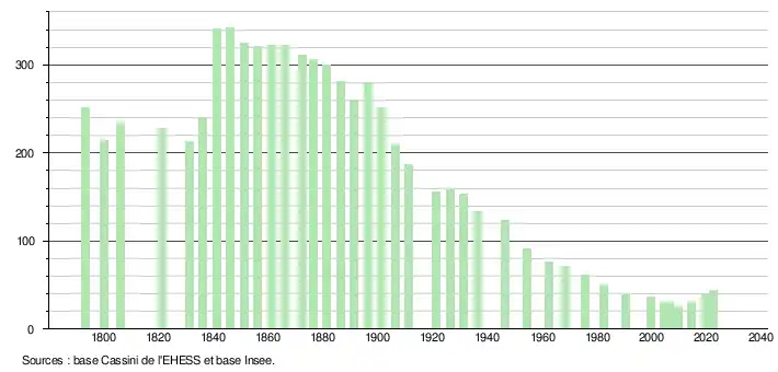 | L'évolution du nombre d'habitants est connue à travers les recensements de la population effectués dans la commune depuis 1793. Pour les communes de moins de 10 000 habitants, une enquête de recensement portant sur toute la population est réalisée tous les cinq ans, les populations de référence des années intermédiaires étant quant à elles estimées par interpolation ou extrapolation[30]. Pour la commune, le premier recensement exhaustif entrant dans le cadre du nouveau dispositif a été réalisé en 2004[31]. En 2022, la commune comptait 44 habitants[Note 7], en évolution de +37,5 % par rapport à 2016 (Hautes-Pyrénées : +1,59 %, France hors Mayotte : +2,11 %). |