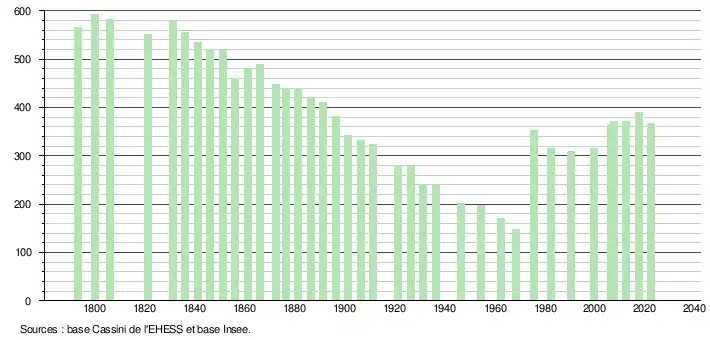 L'évolution du nombre d'habitants est connue à travers les recensements de la population effectués dans la commune depuis 1793. Pour les communes de moins de 10 000 habitants, une enquête de recensement portant sur toute la population est réalisée tous les cinq ans, les populations de référence des années intermédiaires étant quant à elles estimées par interpolation ou extrapolation[20]. Pour la commune, le premier recensement exhaustif entrant dans le cadre du nouveau dispositif a été réalisé en 2007[21].
