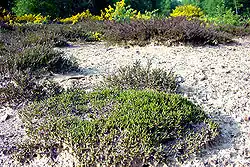 Sur substrat sableux, acide et très pauvre (oligotrophe), on distingue ici l'impact du broutage par les lapins et l'arrivée des ajoncs, légumineuses qui vont enrichir le sol en azote et permettre l'apparition de graminées puis d'arbres, si le manque d'eau ne les élimine pas régulièrement à la suite des incendies