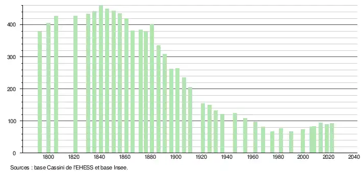 L'évolution du nombre d'habitants est connue à travers les recensements de la population effectués dans la commune depuis 1793. Pour les communes de moins de 10 000 habitants, une enquête de recensement portant sur toute la population est réalisée tous les cinq ans, les populations de référence des années intermédiaires étant quant à elles estimées par interpolation ou extrapolation[36]. Pour la commune, le premier recensement exhaustif entrant dans le cadre du nouveau dispositif a été réalisé en 2008[37].