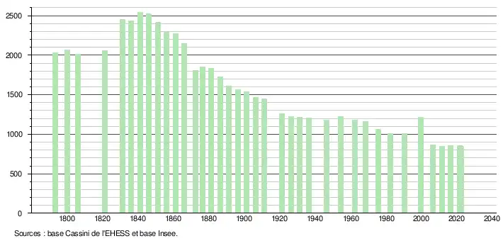 L'évolution du nombre d'habitants est connue à travers les recensements de la population effectués dans la commune depuis 1793. Pour les communes de moins de 10 000 habitants, une enquête de recensement portant sur toute la population est réalisée tous les cinq ans, les populations de référence des années intermédiaires étant quant à elles estimées par interpolation ou extrapolation[31]. Pour la commune, le premier recensement exhaustif entrant dans le cadre du nouveau dispositif a été réalisé en 2006[32].