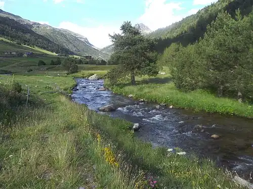 | Estany de l'Isla sur la carte des bassins hydrographiques de l'Andorre | Riu d'Incles à l'entrée de la vallée d'Incles |