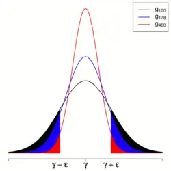 On l'interprète comme le fait que la probabilité de s'éloigner de la valeur à estimer de plus de ε tend vers 0 quand la taille de l'échantillon augmente.