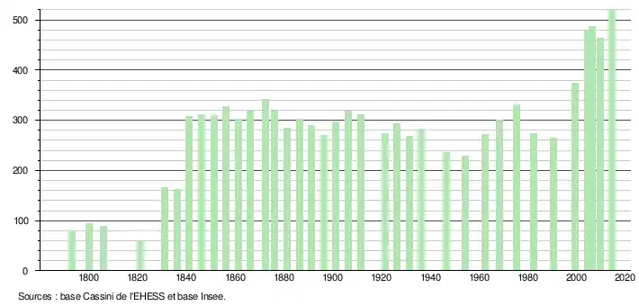 L'évolution du nombre d'habitants est connue à travers les recensements de la population effectués dans la commune depuis 1793. Pour les communes de moins de 10 000 habitants, une enquête de recensement portant sur toute la population est réalisée tous les cinq ans, les populations de référence des années intermédiaires étant quant à elles estimées par interpolation ou extrapolation[6]. Pour la commune, le premier recensement exhaustif entrant dans le cadre du nouveau dispositif a été réalisé en 2004[7].
