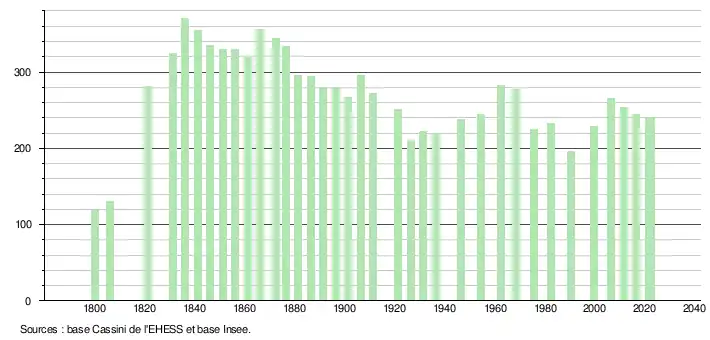 L'évolution du nombre d'habitants est connue à travers les recensements de la population effectués dans la commune depuis 1800. Pour les communes de moins de 10 000 habitants, une enquête de recensement portant sur toute la population est réalisée tous les cinq ans, les populations de référence des années intermédiaires étant quant à elles estimées par interpolation ou extrapolation[33]. Pour la commune, le premier recensement exhaustif entrant dans le cadre du nouveau dispositif a été réalisé en 2006[34].