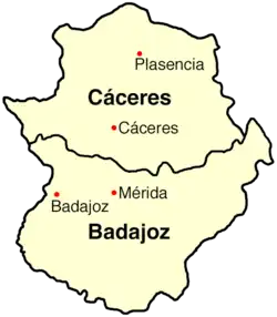 La région est composée de deux provinces, Cáceres au nord (aussi appelée Haute Estrémadure ou Alta Extremadura) et Badajoz au sud (Basse Estrémadure ou Baja Extremadura). La superficie de l'Estrémadure est quasiment la même que celle des Pays-Bas.