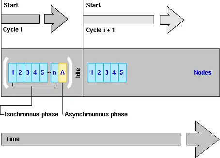 Outre le transfert de données isochrones à chaque cycle de base, certains nœuds peuvent également partager la même tranche de temps pour optimiser l'utilisation de la bande passante. Ainsi, la phase isochrone peut comporter deux types de tranches de temps : celles attribuées aux mêmes nœuds d'un cycle à l'autre et permettant à ces derniers d'émettre leurs données à chaque cycle de base, et celles partagées par plusieurs nœuds émettant leurs données à tour de rôle en l'espace de plusieurs cycles. Ce dernier mode de transfert peut être utilisé pour des données moins importantes mais néanmoins toujours critiques. L'attribution des tranches au cours de chaque cycle revient au nœud MN.