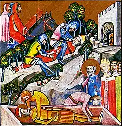 Enluminure représentant un homme en armure et portant une couronne marchant sur le corps d'un autre souverain apparemment mort ; la scène se déroule au milieu d'une bataille