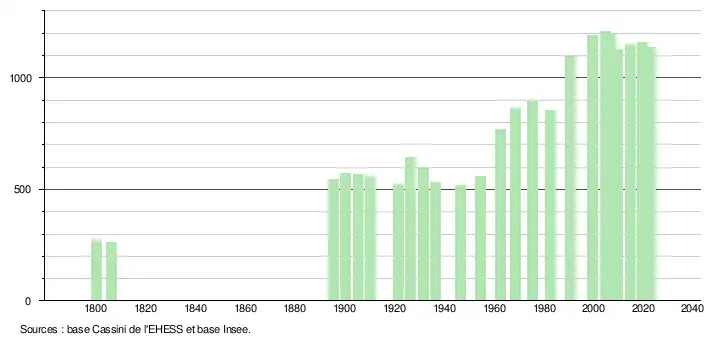 L'évolution du nombre d'habitants est connue à travers les recensements de la population effectués dans la commune depuis 1800. Pour les communes de moins de 10 000 habitants, une enquête de recensement portant sur toute la population est réalisée tous les cinq ans, les populations de référence des années intermédiaires étant quant à elles estimées par interpolation ou extrapolation[18]. Pour la commune, le premier recensement exhaustif entrant dans le cadre du nouveau dispositif a été réalisé en 2004[19].