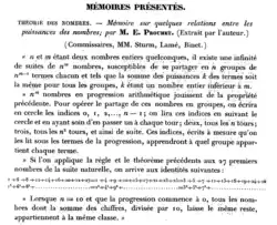 - ↑ Wright écrit à ce propos dans son article Prouhet's 1851 solution of the Tarry-Escott problem of 1910 Amer. Math. Monthly, 66 (mars 1959), 199-201:« Prouhet's note is no more than an "Extrait par l'auteur" of a "Mémoire présenté" to the Academy. The secretaire-archiviste of the Academy was kind enough to inform me that the memoir was returned to the author in 1852. But there appears to be no trace in the literature of its publication. »