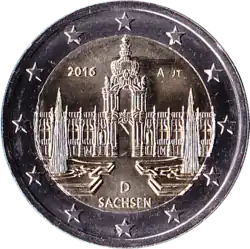 La représentation de la cour intérieure du Zwinger à Dresde, avec au fond la Kronentor (de) et à l'avant-plan des fontaines. En bas, la légende SACHSEN (Saxe) surmontée de l'initiale du pays émetteur D (pour Deutschland). En haut, à gauche, le millésime 2016. L'anneau externe de la pièce comporte les douze étoiles du drapeau européen. | ||||||
