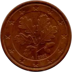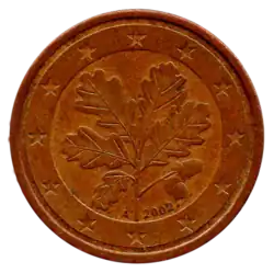 - Pièces de 1, 2 et 5 centimes : Un rameau de chêne composé de 5 feuilles et de 2 glands, à la base duquel est indiqué le millésime. Le tout est entouré des 12 étoiles du drapeau européen en creux dans un anneau. La gravure est de Rolf Lederbogen[1]. Les feuilles de chêne, symbole de robustesse, étaient déjà présentes sur les pièces en pfennig[2].