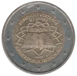 Tous les pays de la zone euro, dont l'Allemagne, ont émis le 25 mars 2007 une pièce commémorative de 2 € pour célébrer le 50e anniversaire du traité de Rome. Le centre de la pièce représente le traité signé par les six États membres fondateurs devant un arrière-plan évoquant le dallage, dessiné par Michel-Ange, de la place du Capitole, à Rome, où le traité a été signé le 25 mars 1957. Le mot EUROPA (Europe) figure au-dessus du livre. La légende RÖMISCHE VERTRÄGE (Traité de Rome) et 50 JAHRE (50 ans) est inscrite au-dessus du dessin. Le millésime 2007 et le nom du pays émetteur BUNDESREPUBLIK DEUTSCHLAND sont inscrits sous le dessin. L'anneau externe de la pièce comporte les douze étoiles du drapeau européen. | ||||||