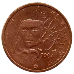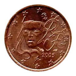 - Pièces de 1, 2 et 5 centimes : L'effigie de Marianne, allégorie de la République française, portant le bonnet phrygien, tournée légèrement vers la gauche. À gauche, la mention du pays émetteur représenté par les initiales RF pour République française, au-dessus du millésime. Le tout est entouré des 12 étoiles du drapeau européen. La gravure est une création de Fabienne Courtiade.