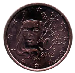 - ↑ « Arrêté du 31 décembre 2001 relatif aux types des faces nationales des pièces françaises de monnaie libellées en euros destinées à la circulation », sur Journal officiel de la République française, (consulté le ).