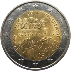 La représentation stylisée d'une foule joyeuse, brandissant des instruments de musique. Des notes flottent dans l'air sous les mots Fête de la MUSIQUE, en deux lignes, et la date 21 JUIN 2011. En haut, descendant vers la droite, les mots 30e ANNIVERSAIRE et en bas l'indication du pays émetteur RF (pour République française). L'anneau externe de la pièce comporte les douze étoiles du drapeau européen. | ||||||