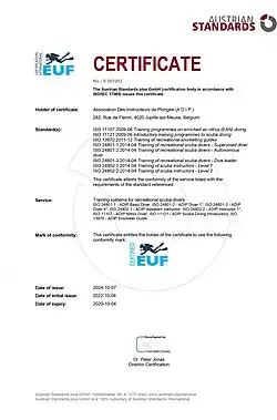 Depuis janvier 2016, les organismes de formation de plongée sous-marine suivants ont été certifiés par l' EUF Certification International depuis 2004[16]: