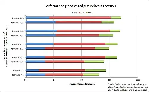 - « Xok » a été utilisé par une autre équipe américaine pour développer des bibliothèques et des applications en environnement multithreading pour des besoins plus évolués[38],[39]. « SMP-Xok » a alors vu le jour dans la même période : exo-noyau dédié à l'architecture x86 32 bits multiprocesseur[20]. De par sa simplicité et sa légèreté de code, l'exo-noyau intéresse le domaine universitaire : « Nemesis »[note 5], noyau d'étude, a vu le jour à l'université de Cambridge[note 6]. Ce noyau a pour avantage d'être implémenté pour de nombreuses plateformes : x86, RISC 64 bits et StrongARM[40].