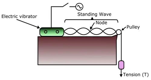 Les ondes mécaniques transversales produites sur la corde par un vibreur électrique se propagent jusqu'à une poulie. Là, une masse tend la corde, de sorte que l'onde incidente se réfléchit et repart dans le sens opposé. La rencontre et la superposition des ondes incidentes et réfléchies est à l'origine d'un phénomène d'interférence d'ondes. En fixant la distance entre le vibreur et la poulie, on peut déterminer une tension appropriée pour laquelle apparaissent des ondes stationnaires. On distingue alors des points sur cette onde qui demeurent immobiles, appelés nœuds.