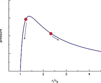 et tend vers zéro au fur et à mesure que r augmente. Ce comportement est remarquable lors du gonflage d'un ballon : une grande force est requise au début mais après que le ballon se soit élargi (à un rayon supérieur à rp) une force moins importante est nécessaire pour continuer le gonflage.