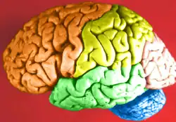 Cerveau humain en fausses couleurs. La taille particulièrement importante des lobes frontal (en orange) et pariétal (en jaune) est le résultat de l'expansion corticale