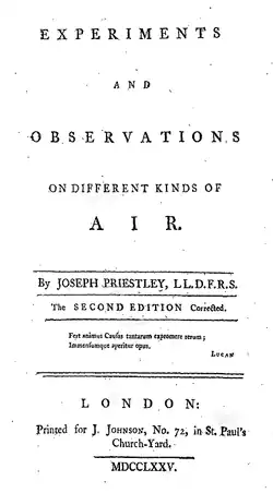 - ↑ Joseph Priestley, Experiments and Observations on Different Kinds of Air. London W. Bowyer and J. Nichols, 1774; —. Experiments and Observations on Different Kinds of Air. Vol. 2. London: Printed for J. Johnson, 1775; —. Experiments and Observations on Different Kinds of Air. London : Printed for J. Johnson, 1777. Il existe plusieurs éditions de ces volumes, toutes d'égale importance.