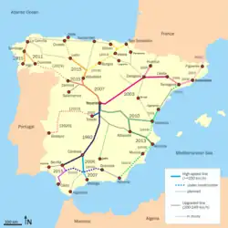 Carte des lignes de l'AVE. La ligne Madrid-Séville de 1992 apparaît en noir.