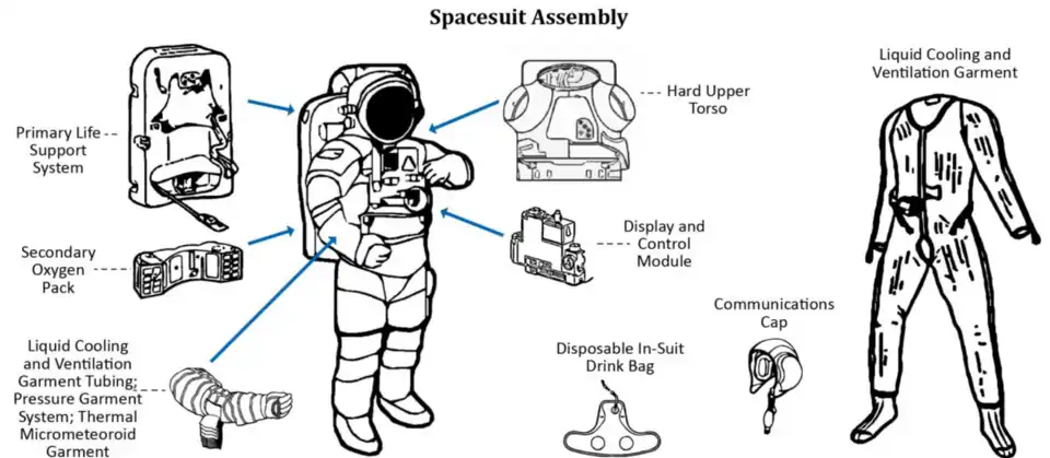 - Un sous-vêtement destiné à réguler la température LCVG (Liquid Cooling and Ventilation Garment), qui comprend un réseau de tubes dans lequel circule de l'eau liquide fraîche destinée à maintenir une température adéquate ainsi que des tubes de ventilation pour évacuer les gaz rejetés par la respiration et le corps (oxygène, dioxyde de carbone, vapeur d'eau, traces d'autres éléments)[5].
