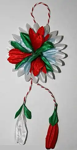 Quoi qu’il en soit, les martenitsi/mărțișoare sont aujourd’hui des talismans que l’on épingle à la poitrine, portés pendant huit jours, formés d’un fil rouge et d’un fil blanc tressés ensemble, auquel on peut attacher des objets décoratifs : des fleurs ou des animaux en bois, en céramique, en verre ou en métal[8],[9].